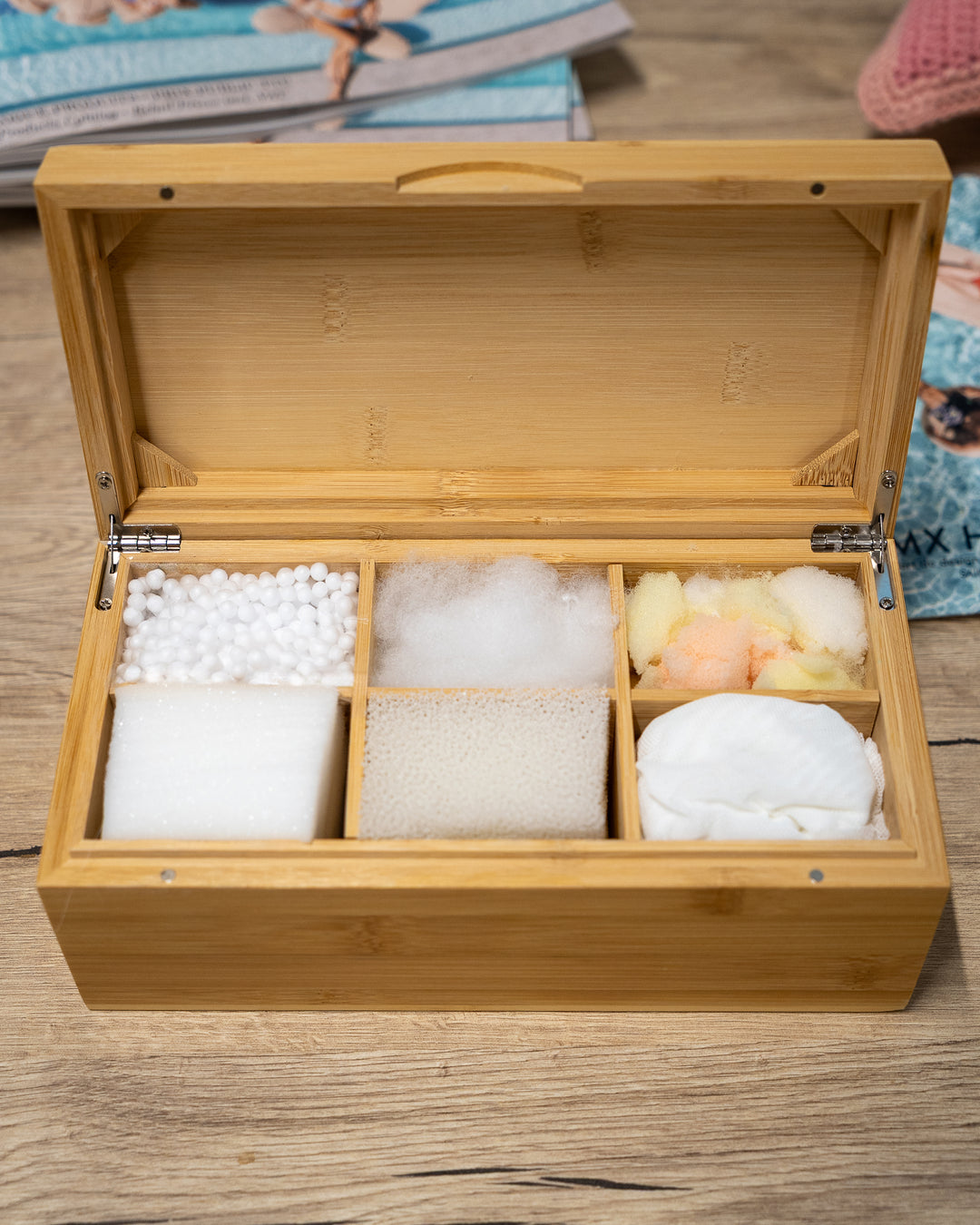 Nos matières : Mousse (coupe sur mesure), fibres, ouate, flocons de polyester, billes de polyester...